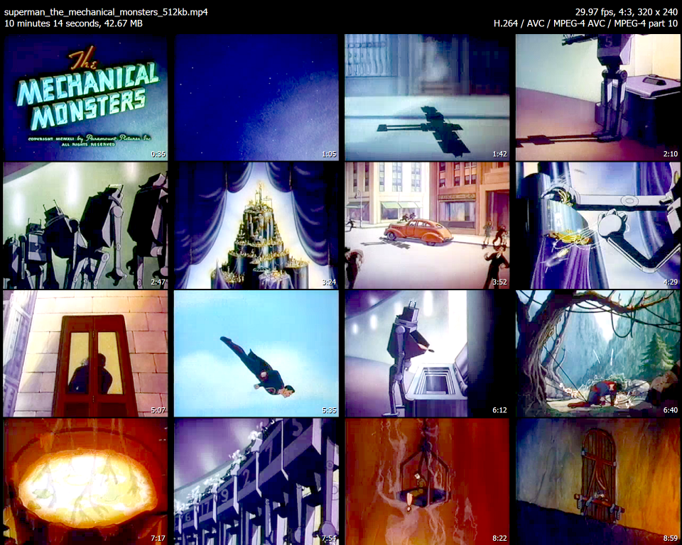 Takes a video file and creates a contact sheet from the video, a contact sheet is a single image showing frames from various parts of the video, a preview as one image. Take this example from an early Superman cartoon: