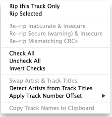 |  | Quickly rip single track, or selected tracks (selected indicated by blue bar, not check mark). After ripping once the options to re-rip will be present if there were insecure tracks, or if the CRC calculated for each track was different on a re-rip (a sure sign one of the rips had an error). Swap Artist and Track Titles can be selected if Compilation is checked and is designed for freedb originated meta data, sometimes these two items are swapped incorrectly. Detect Artists from Track Titles can be useful if all the tracks have Artist - Title and the artist field is blank, this option will remove the artist value to the title. Apply Track Number Offset will be useful to people ripping multi-CD sets where they wish for track 1 for CD 2 to continue after the end track number for the previous CD, to apply an offset of more than 20 select this option twice. Copy Track Listing to Clipboard exports the track listing (in text form) so it can be pasted into other programs. |