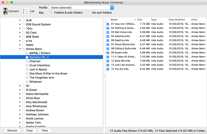 It is possible to exclude audio types, by clicking the Filter button. Only audio types with a check mark are converted. Filter also allows selection of Artists, or Albums, by default all artists are included, by clicking the 'Exclude All' button, only checked artists are converted.